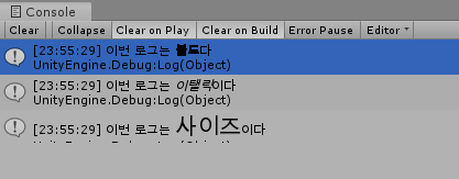 위 텍스트들을 그대로 Debug.Log(string value)로 넣어보자.